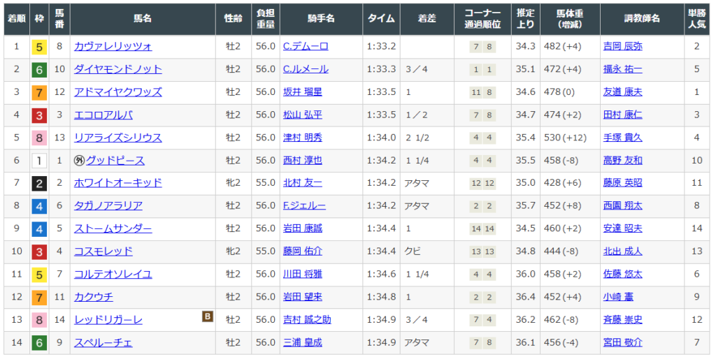 勝ったのは内を突いたカヴァレリッツォ。逃げた2着ダイヤモンドノットは終始内を走って2着。
